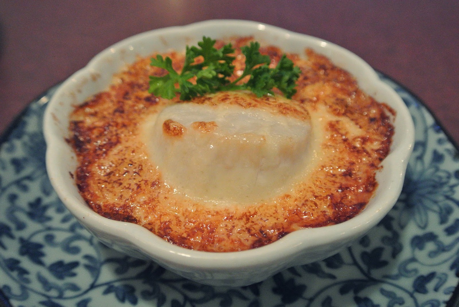 Off of their appetizers section, my mom ordered oyster motoyaki, or baked oyster as it's referred to on the menu ($4.50). In typical motoyaki fashion, the oyster is covered in misonnaise sauce (basically a combination of miso paste and Japanese mayo) and then given a quick broil in the oven to brown the top. Some restaurants keep the oyster in the shell, but given that this preparation somewhat masks the freshness of the seafood anyway, I forgive them for putting what I assume is an already shucked oyster from a jar onto the plate.