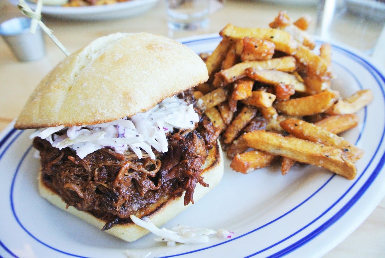 For myself, I went with the pulled pork sandwich ($15.00) with house slaw and bourbon BBQ sauce. Overall, I thought the sandwich was okay. The pork was tender and relatively moist. There was a bit too much BBQ sauce mixed in for my liking, but I appreciated the slaw for that reason, as it helped break up the strong sauce flavour. As for the fries, they were really good for the first few bites. A few soggy pieces here and there but hardly nothing to complain about. After a while, the copious amount of garlic just becomes too salty and overpowering. Sharing the fries (or plenty of water refills) is definitely a must.