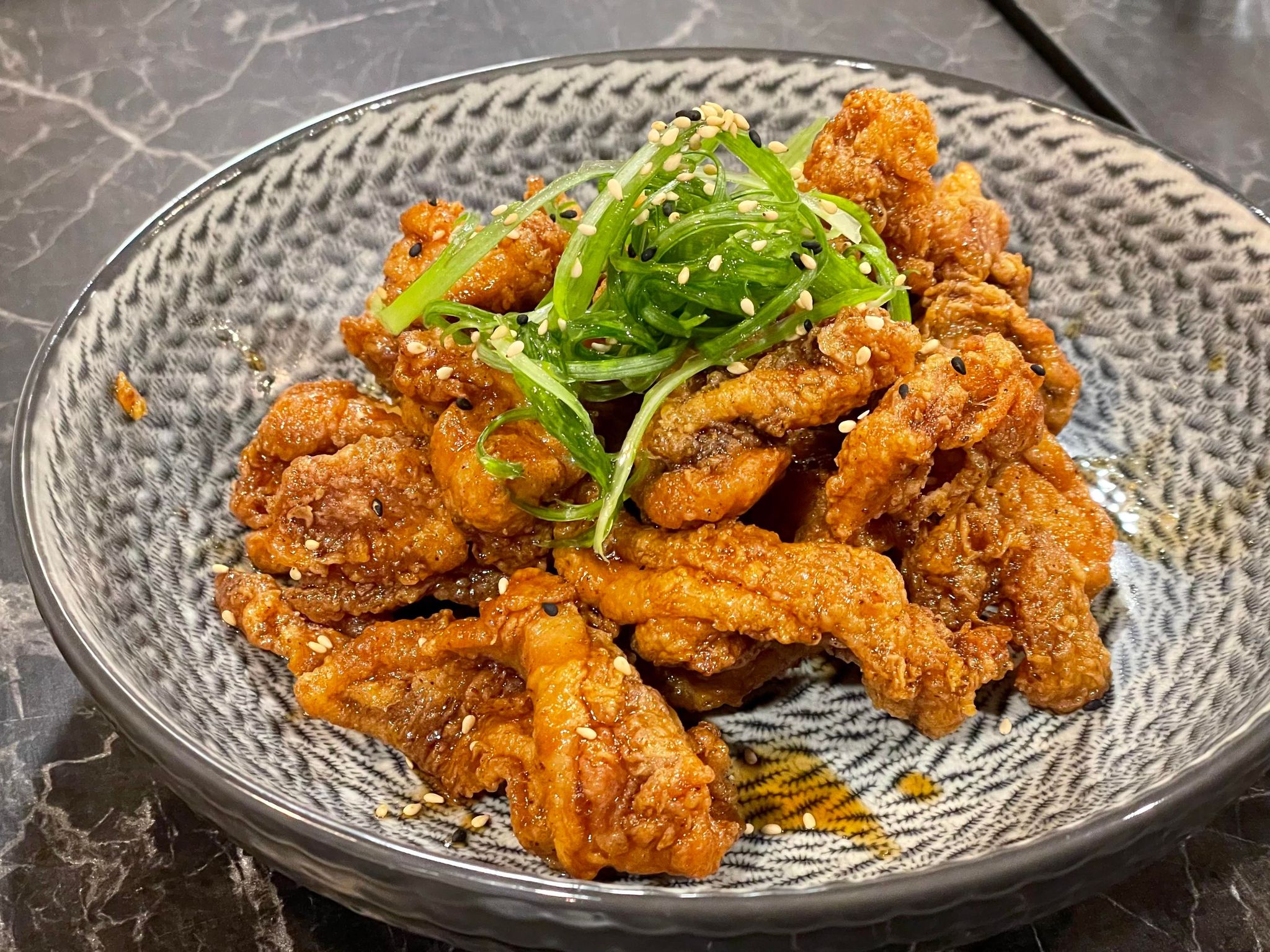 I can't resist ordering Korean fried chicken whenever it's available. We chose the garlic soy sauce flavour ($15.00) which comes served in boneless, bite-sized pieces. The chicken was crispy and tender, with a sweet, garlicky soy glaze. It turned out to be one of our favourite bites of the evening.